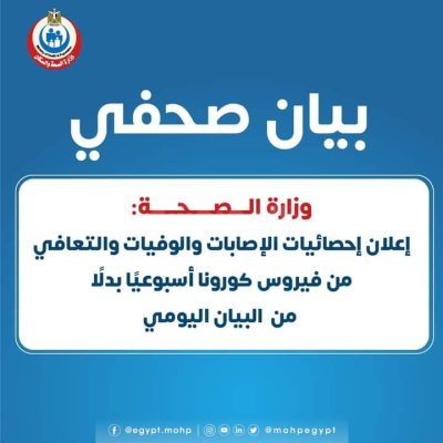 عاجل ..الصحة تقرر إعلان إحصائيات الإصابات والوفيات والتعافي من فيروس كورونا أسبوعيا بدلا من البيان اليومي