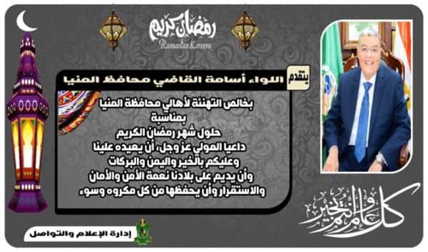 ويتقدم المحافظ، بخالص التهنئة لأهالي محافظة المنيا، بمناسبة حلول شهر رمضان المبارك، داعيًا المولى العلى القدير أن يعيد هذه المناسبة المباركة على بلادنا باليمن والخير والبركات وأن يحفظ “مصر” وينعم عليها بالأمن والأمان والسلام والاستقرار.