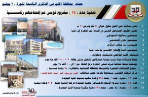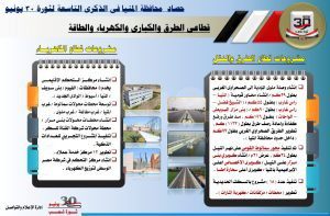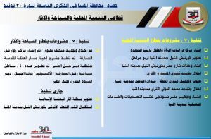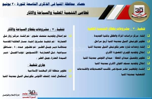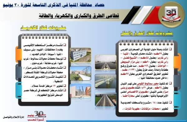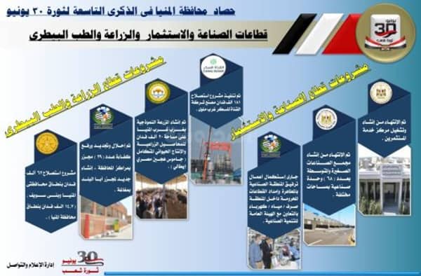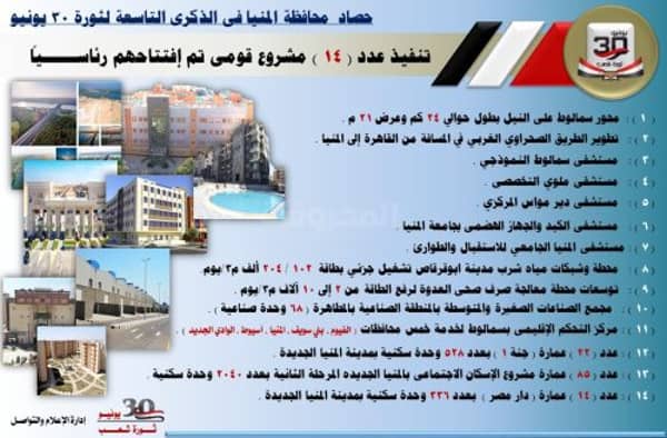 وأكد محافظ المنيا في تصريحات له بمناسبة الذكري التاسعة لثورة 30 يونيو أن مصر دخلت مرحلة تنمية حقيقية اعتباراً من عام 2014 منذ تولي السيد الرئيس عبد الفتاح السيسي رئيس الجمهورية، حيث تشهد محافظة المنيا، إنجازا كبيرا لم تحققه منذ عقود طويلة، على مستوى كافة القطاعات، مما ساهم في إحداث نقلة نوعية كبيرة في جميع الخدمات، من خلال تنفيذ مشروعات ضخمة بجميع مراكز المحافظة، منها ما تم الانتهاء منه وأخرى لا زال العمل يجرى بها.