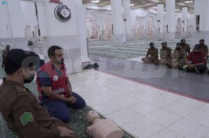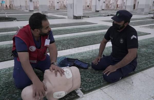 ودربت هيئة الهلال الأحمر 150 من متطوعي الهيئة العاملين بالحرم المكي الشريف ومنسوبي الهيئة العاملين بمراكز الحرم بـ 40 متدرباً, إضافة إلى 130 من أفراد الدوريات الأمنية و50 من منسوبي الدفاع المدني على طرق استخدام أجهزة الصدمات بشكل سريع على المرضى ممن يعانون من بعض المشاكل القلبية بمكان الموقع، ريثما تصل سيارة الإسعاف، حيث تلقى المتدربون محاضرات توعوية مختلفة, إلى جانب برنامج الإسعافات الأولية، ودورة دعم الحياة الأساسي (BLS).