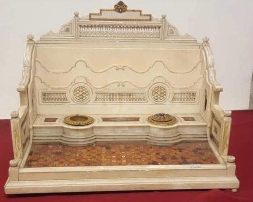 يعرض تعليقة من مقتنيات أسرة محمد علي، على شكل باب معبد فرعوني مزين بكتابات وأعلى الباب نسر ناشر جناحيه، وفي المنتصف تمثال لشخص يجلس على كرسي حجري، مثبت بإطار من الذهب.
