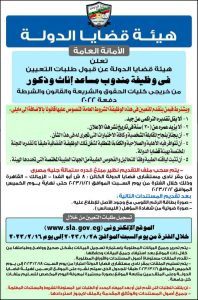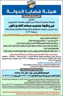أعلنت هيئة قضايا الدولة عن قبول طلبات التعيين في وظيفة مندوب مساعد إناث وذكور من خريجي كليات الحقوق والشريعة والقانون والشرطة دفعة 2022 وفقا للإعلان التالى