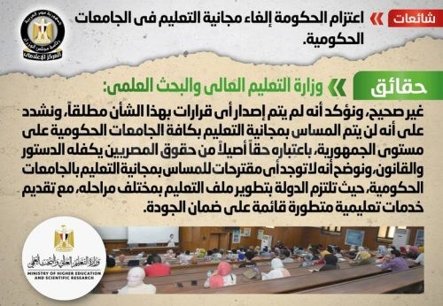 تداولت بعض المواقع الإلكترونية وصفحات التواصل الاجتماعي أنباء بشأن اعتزام الحكومة إلغاء مجانية التعليم في الجامعات الحكومية، وقد قام المركز الإعلامي لمجلس الوزراء بالتواصل مع وزارة التعليم العالي والبحث العلمي، والتي نفت تلك الأنباء تماماً،