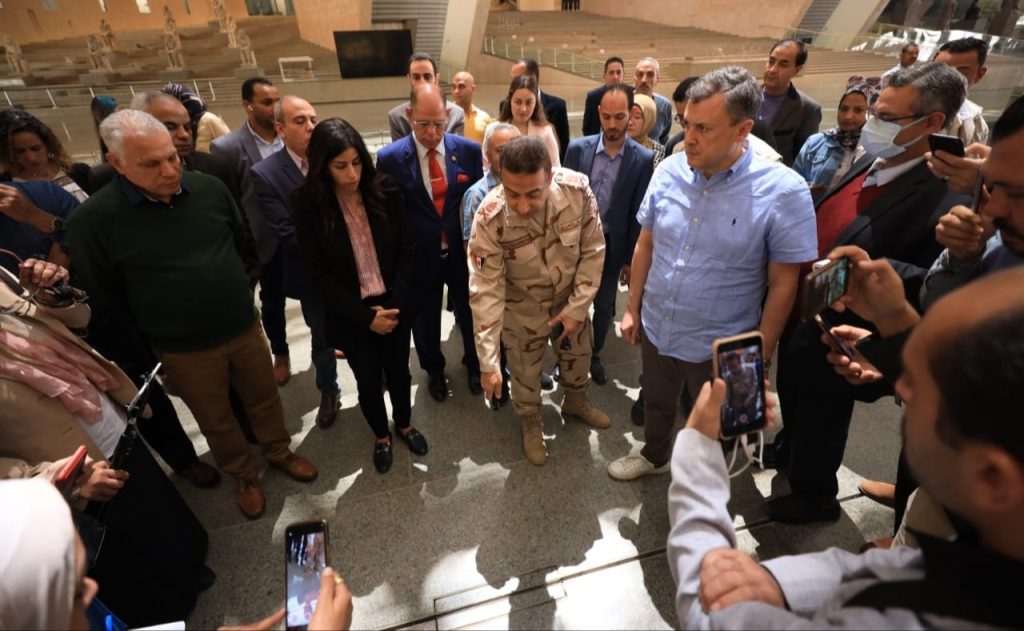 وقد رافق  الوزير خلال الجولة اللواء عاطف مفتاح المُشرف على مشروع المتحف المصري الكبير والمنطقة المحيطة به، و أحمد عبيد مساعد الوزير لشئون قطاع مكتب الوزير، والدكتور الطيب عباس مساعد الوزير للشئون الأثرية بالمتحف، والدكتور حسين كمال مدير عام شئون الترميم بالمتحف، والدكتور عيسى زيدان مدير عام الشئون التنفيذية لترميم ونقل الآثار بالمتحف، ويمنى إسماعيل معاون الوزير لمتابعة أعمال المتحف، وميريت السيد المدير التنفيذي لشركة ليجاسي للتنمية والإدارة، إحدى الشركات التابعة لمجموعة حسن علام القابضة والقائمة بتشغيل الخدمات بمجمع المتحف المصري الكبير.