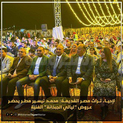 تواجد النائب البرلماني محمد تيسير مطر ضمن الحضور في عروض “ليالي الجبخانة” الفنية، والتي تنظمها جمعية تواصل بالتعاون مع وزارة التضامن الاجتماعي، وتقام بجوار سور الجبخانة في منطقة عزبة خير الله، بحي مصر القديمة، بهدف استعادة رونق المكان الأثرى وتسليط الضوء عليه، وجعلها عامل جذب واستقطاب للمهتمين بالتراث من خارج سكان المنطقة، وأيضاً لتغيير مفهوم المناطق العشوائية لدى السكان.