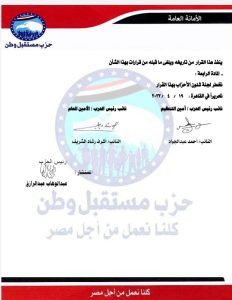 بعد الاطلاع على القانون رقم (40) لسنة 1977 والخاصة بالأحزاب السياسية وتعديلاته .وعلى النظام الأساسي واللائحة الداخلية لحزب مستقبل وطن. وبناء على ما تم عرضه، تقرر ما يلى: