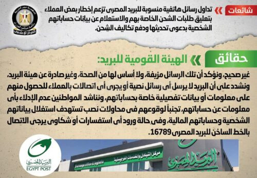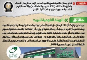 مشددةً على أن البريد لا يرسل أي رسائل نصية أو يجري أي اتصالات بالعملاء للحصول منهم على معلومات أو بيانات تفصيلية خاصة بحساباتهم، مُناشدةً المواطنين عدم الإدلاء بأي معلومات عن حساباتهم، تجنباً لوقوعهم في محاولات نصب تستهدف استغلال بياناتهم الشخصية وحساباتهم المالية، وفي حالة ورود أي استفسارات أو شكاوى يرجى الاتصال بالخط الساخن للبريد المصري 16789.