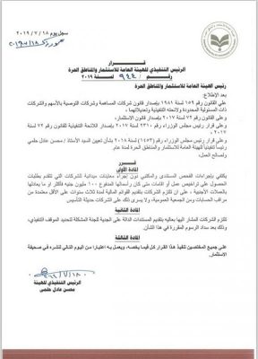 أصدرت الهيئة العامة للاستثمار والمناطق الحرة، قرارًا بالاكتفاء بإجراءات الفحص المستندي والمكتبي دون إجراء معاينات ميدانية للشركات التي تتقدم بطلبات الحصول على تراخيص عمل أو إقامات، إذا كان رأس مال الشركة المدفوع 100 مليون جنيه أو أكثر، وذلك بغرض تسهيل إجراءات عمل لجان الموقف التنفيذي للشركات.