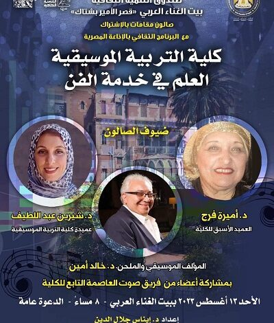 ينظم صالون مقامات بالتعاون مع البرنامج الثقافي بالإذاعة المصرية ندوة تحت عنوان” كلية التربية الموسيقية.. العلم في خدمة الفن ” في إطار الندوات التي ينظمها بيت الغناء العربي وذلك في تمام الساعة الثامنة مساء غدا الأحد بقصر الأمير بشتاك بشارع المعز لدين الله الفاطمي والتابع لصندوق التنمية الثقافية .