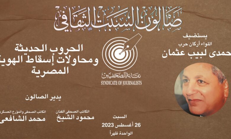 تحت عنوان ( الحروب الحديثة ومحاولات اسقاط الهوية المصرية) تدور ندوة صالون السبت الثقافي بنقابة الصحفيين المقرر اقامتها في الواحده بعد ظهر يوم السبت المقبل 26 اغسطس الجاري بقاعه طه حسين الدور الرابع بالنقابة.