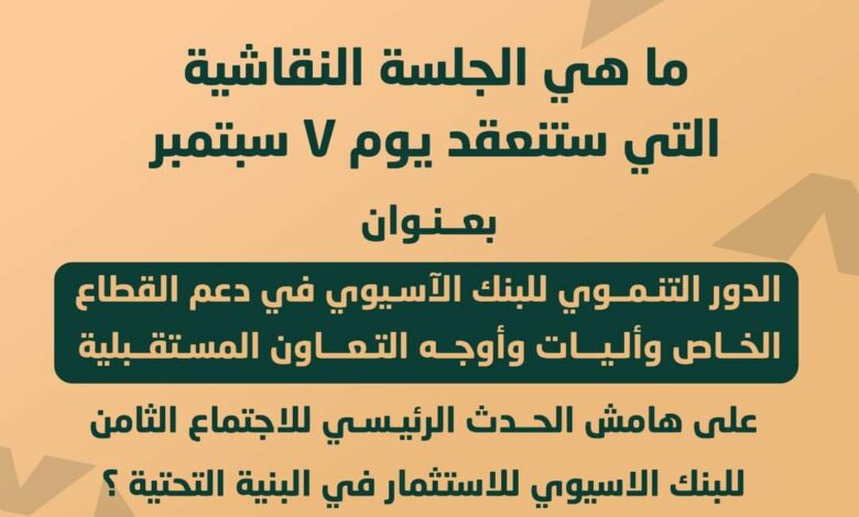 تستضيف وزارة المالية في 7 سبتمبر 2023 بمقر وزارة المالية بالعاصمة الإدارية الجديدة جلسة نقاشية بعنوان (الدور التنموي للبنك الاسيوي في دعم القطاع الخاص وأليات وأوجه التعاون المستقبلية) على هامش الحدث الرئيسي للاجتماع الثامن للبنك الاسيوي للاستثمار في البنية التحتية، والتي تمثل فرصة حقيقية للقطاع الخاص، لمعرفة المزيد حول ما يمكن ان يقدمه البنك من دعم لمشروعات مجتمع الاعمال التي تقع ضمن نطاق عمل البنك والمساعدة على تحقيق نمو مستدام وتوفير المزيد من فرص العمل.