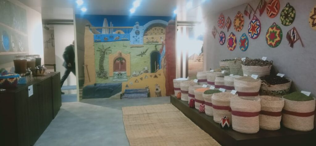 كما خُصص مكان بالجناح للترويج لبعض المنتجات التراثية المصرية المختلفة كالمشروبات والتمور المصرية، كما تم تخصيص مكان بالجناح مصنوع على الطراز الأسواني النوبي لعرض منتجات التراث النوبي بأسوان منها منتجات الحرف اليدوية والتوابل المختلفة، كما يتم توزيع على الجمهور من زائري الجناح المصري، هدايا تذكارية مصممة على الطراز الأسواني.