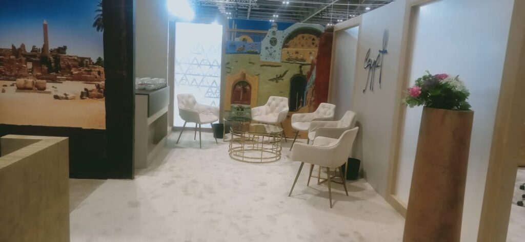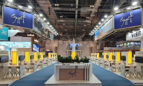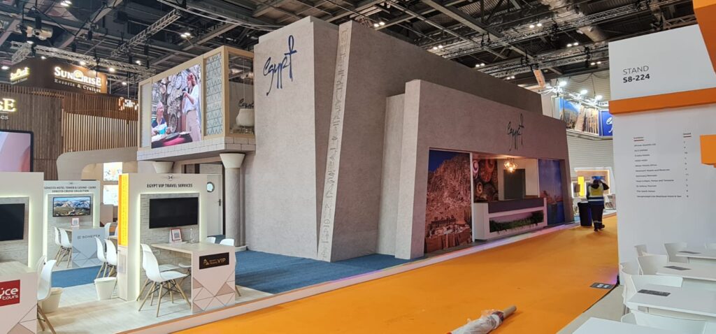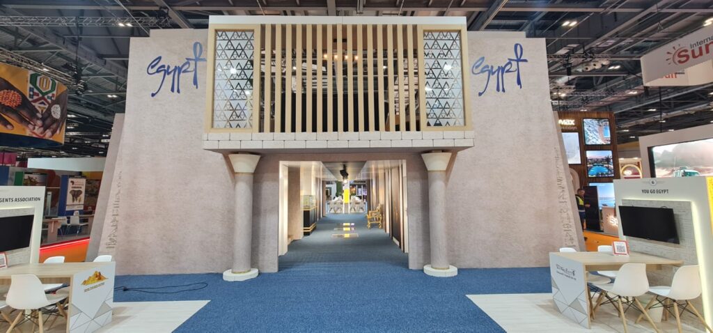 بالصور.. تصميم الجناح المصرى المشارك فى بورصة لندن الدولية للسياحة WTM 2023 لمعبد فرعونى مشابه للمتحف الجديد