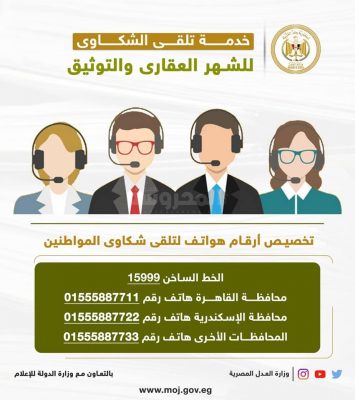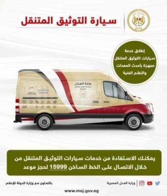 في إطار حرص وزارة العدل على الاستمرار في تيسير خدمات التوثيق للمواطنين .ووفقا لتوجيهات المستشار عمر مروان وزير العدل، بدا من البوم الجمعة تشغيل عدد (12) مركزاً لخدمات مصر المتنقلة (سيارات) يوم الجمعة من كل أسبوع، بدءً من الساعة الواحدة ظهراً وحتى الساعة التاسعة مساءً لإتاحة كافة معاملات التوثيق،