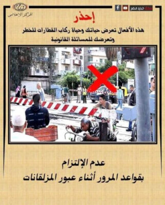 ناشدت وزارة النقل السادة المواطنين بضرورة توخي الحذر عند عبور مزلقانات السكة الحديد والالتزام بتعليمات الهيئة عند العبور و الالتزام بالعبور بعد فتح المزلقان ومرور القطار وعدم اقتحام المزلقان او السير عكس الاتجاه أثناء غلقه حتى لايؤدي ذلك إلى ازهاق الارواح وتعطيل مسير القطارات