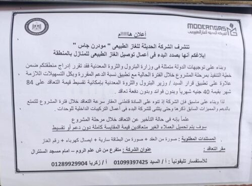 أكد مسىؤلو الشركة أنه جارى سرعة الانتهاء من توصيل شبكة الغاز الطبيعى بمنطقة حى الشروق بالكيلو ٧ ،مع امتدادها إلى ٦كم حتى الآن وجارى التعاقدات مع المواطنين من خلال. مندوبى الشركة بالموقع من الساعة ٩ص إلى ٣ عصرا مع التيسير على المواطنين الذين تم توصيل الغاز وتشغيله بعدد من المنازل مع تيسير الإجراءات الإدارية والمالية بقسط شهرى لمدة ٧ سنوات، كما يتم متابعة أعمال إعادة الشيىء لأصله يوميا مع إلزام مقاول التنفيذ برفع كافة المخلفات حفاظا على الشكل الحضارى ،وجارى حاليا الإسراع في تنفيذ شبكة الغاز بمجمع المخابز مع تعديل المسار لتقليل التكسير داخل المجمع