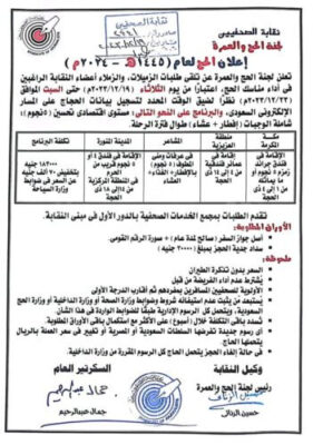 تعلن لجنة الحج والعمرة بنقابة الصحفيين عن تلقى طلبات الزميلات، والزملاء أعضاء النقابة الراغبين فى أداء مناسك الحج، اعتبارًا من يوم الثلاثاء (19/12/2023م) حتى السبت الموافق (23/12/2023م) نظرًا لضيق الوقت المحدد لتسجيل بيانات الحجاج على المسار الإلكترونى السعودى، والبرنامج على النحو التالى: مستوى اقتصادى تحسين (5نجوم): شاملة الوجبات (إفطار + عشاء) طوال فترة الرحلة.مكة المكرمة منطقة العزيزية المشاعر المدينة المنورة تكلفة البرنامج