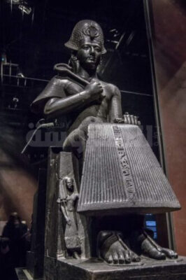 هذا التمثال يُمثّل تحفة من روائع فنّ النحت المصري يُمثّله في صورة مختلفة عن الهيئات الملكـيّة الرسمية التي كانت مألوفة من قبـل، فيـظهر المـلك جالـساً على كرسـي العرش، مستنداً بظهره على عمود عليه كتابات، مرتدياً لباساً مصريّاً فضفاضاً، وعلى رأسه التاج الأزرق، او تـاج الخبرش (خوذة القتال والحرب)، ويمسك بصولجان الحقا (السُلطة) في يده، بينما يرتـدي في قدمـيه حذاء ذا سيـور (صـندل) يدهس به أعداء مصر المُحيطين بها، المُمثّلين في شكل تسعة أقواس، تأكيداً لهيمنة الملك المُطلقة على مصر والبلاد الأجنبية.