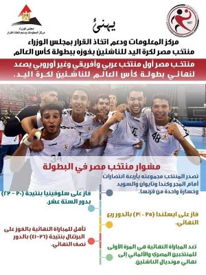 هنأ مركز المعلومات ودعم اتخاذ القرار التابع لمجلس الوزراء، منتخب مصر لكرة اليد للناشئين لفوزه ببطولة كأس العالم لأول مرة فى تاريخه، بعد الفوز على منتخب المانيا بنتيجة 32 – 28.