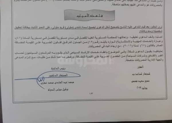 وأشار محمد فوزى، إلى أن القضية لم تستمر تداولها لأكثر من 18 شهراً أصدرت فيها قرارها بضرورة تقديم تقرير من مفوضى مجلس الدولة ، والذى أكد على أحقية المرشدين السياحيين فى إعفائهم من سداد هذه الضريبة ، وأن الحكم الصادر من المحكمة والمفوضين قد نص على إحالة القضية للمحكمة الدستورية العليا لإقرار (اعفاء خدامت المرشدين السياحيين من ضريبة القيمة المضافة)وهو ما تعول عليه النقابة العامة للمرشدين السياحيين فى صدور قرار وحكم من الدستورية العليا بإعفاء أعضائها من ضريبة القيمة المضافة .