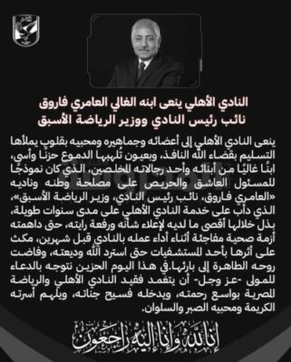 وقال النادي في بيان منذ قليل “ينعى النادي الأهلي إلى أعضائه وجماهيره ومحبيه بقلوب يملأها التسليم بقضاء الله النافذ، وبعيون تُلهبها الدموع حزنًا وأسى، ابنًا غاليًا من أبنائه وأحد رجالاته المخلصين، الذي كان نموذجًا للمسئول العاشق والحريص على مصلحة وطنه وناديه العامري فاروق، نائب رئيس النادي، وزير الرياضة الأسبق”.