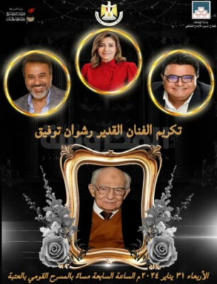 تحت رعاية وزيرة الثقافة  الدكتورة نيفين الكيلاني، وإشراف رئيس قطاع شئون الإنتاج الثقافي المخرج الكبير خالد جلال؛ يقيم المركز القومي للمسرح والموسيقى والفنون الشعبية برئاسة الفنان القدير إيهاب فهمي؛ احتفالية كبرى لتكريم الفنان القدير رشوان توفيق؛ على مشوراه الفني، وعطائه الفني المستمر- أطال الله عمره- وذلك في السابعة مساء الأربعاء المقبل 31 يناير 2024، بالمسرح القومي.