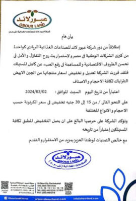 قررت شركة عبور لاند للصناعات الغذائية ومنتجات الألبان، تخفيض أسعار منتجاتها حسب الأحجام والأنواع المختلفة، اعتبارا من يوم السبت 2 مارس 2024.