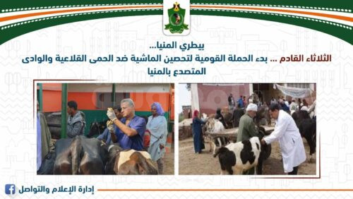 أعلن اللواء أسامة القاضي محافظ المنيا،بدء الحملة القومية لتحصين الماشية ضد مرض الحمى القلاعية والوادي المتصدع يوم الثلاثاء القادم الموافق ١٩ مارس الجارى على مستوى كافة قرى ومراكز المحافظة، وذلك فى إطار خطة الهيئة العامة للخدمات البيطرية حفاظا على الثروة الحيوانية.