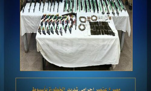 واوضح بيان الداخلية انه بإستهدافه بدائرة مركز شرطة الفتح بأسيوط بادر بإطلاق الأعيرة النارية تجاه القوات وأسفر التعامل عن مصرعه وعُثر بحوزته على (9 بندقية آلية – 15 بندقية خرطوش – 24 فرد محلى – 9 خزينة – عدد من الطلقات مختلفة الأعيرة – 3 كيلو جرام لمخدر الحشيش – كيلو جرام لمخدر الشابو – كمية من مخدر الهيروين).