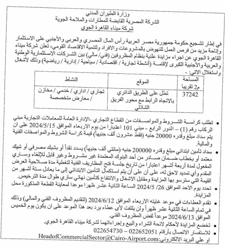 من الإدارة العامة للمعاملات التجارية – مبنى الركاب رقم (1) – الدور الرابع – مبنى 101، وذلك بدءًا من الأربعاء 15 مايو 2024، مقابل 20,000 جنيه. - قيمة التأمين الابتدائي: