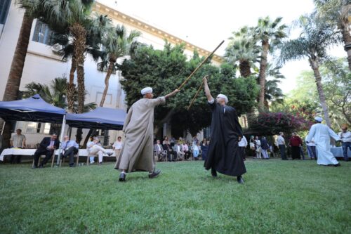 فيما أستمتع الحضور بعرض لفن التحطيب ، بأداء مميز لهذا الفن الشعبي الذى يعكس جزءًا مهمًا من التراث الثقافي لإسنا.