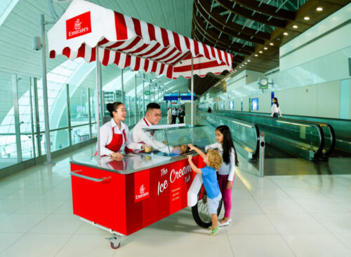 آيس كريم مجاني – احصل على آيس كريم مجاني لجميع أفراد العائلة حتى 28 يوليو. يمكن للعملاء، كل يوم جمعة وسبت وأحد بين الساعة 12 ظهراً و6 مساءً، زيارة عربات الآيس كريم المخططة باللونين الأحمر والأبيض التابعة لطيران الإمارات في المبنى رقم 3 والاختيار من بين مجموعة من النكهات بما في ذلك الفانيليا والشوكولاتة ودولسي دي ليتشي وسوربيه المانجو وسوربيه الليمون.