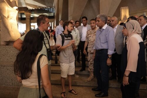 حرص  شريف فتحي وزير السياحة والآثار، خلال الجولة التفقدية التي قام بها بالمتحف المصري الكبير، على لقاء مجموعة من الزائرين والسائحين الأجانب خلال تواجدهم بمنطقة الدرج العظيم بالمتحف، وذلك ضمن الجولات الإرشادية المحدودة التي يتم تنفيذها حالياً بالمتحف والتي تشمل كل من مناطق الدرج العظيم، والمسلة المعلقة، وصالة الاستقبال الرئيسية المعروفة باسم البهو العظيم، والبهو الزجاجي.