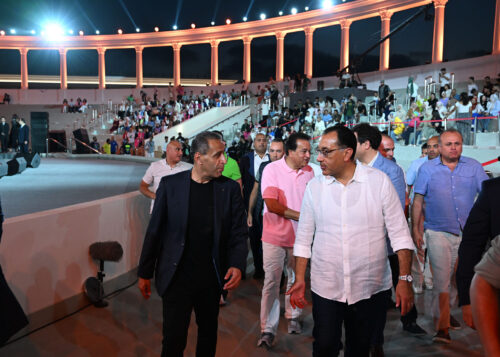 ثمّ توجّه رئيس مجلس الوزراء ومرافقوه بعد ذلك إلى المسرح الروماني بالمدينة التراثية بمدينة “العلمين الجديدة” لحضور حفل يتضمن عددًا من العروض الفنية المتنوعة والمُبتكَرة، واستمع إلى كلمات ألقاها كلٌ من: وزير الثقافة، ورئيس مجلس إدارة الشركة المتحدة للخدمات الإعلامية، قبل بدء الحفل، وقد أعربوا من خلالها عن ترحيبهم بزيارة وتشريف رئيس الوزراء اليوم.