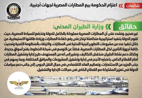 وقد قام المركز الإعلامي لمجلس الوزراء بالتواصل مع وزارة الطيران المدني، والتي نفت تلك الأنباء، مُؤكدةً أنه لا صحة لاعتزام الحكومة بيع المطارات المصرية لجهات أجنبية، مُشددةً على أن المطارات المصرية مملوكة بالكامل للدولة وتخضع للسيادة المصرية، حيث تقوم الدولة بتنفيذ استراتيجية متكاملة ترتكز على رفع كفاءة المطارات وزيادة طاقتها الاستيعابية، من خلال تنفيذ عدد من مشروعات التطوير للبنية التحتية في المطارات، والارتقاء بالمنظومة الأمنية وتحديث كافة أجهزة التأمين لكل المطارات المصرية،