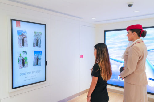 كما يتضمن المتجر شاشات تفاعلية كبيرة إلى جانب شاشات الخدمة الذاتية المدعومة بالتكنولوجيا الذكية والتي تعمل على تقليص أوقات الانتظار وتسهيل الخدمة بشكل أسرع، وشاشات LED تعرض أحدث منتجات طيران الإمارات وعروضها الترويجية.
