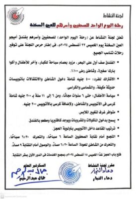 تعلن لجنة النشاط عن (رحلة اليوم الواحد) للصحفيين وأسرهم بفندق أميجو العين السخنة يوم الخميس 22 أغسطس 2024م، فى إطار حرص اللجنة على توفير رحلات تناسب الجميع.