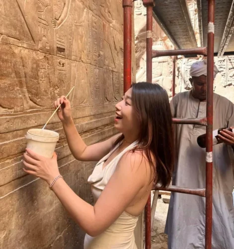 أثارت صور تظهر لـ سائحة صينية الجنسية خلال تواجدها داخل معبد الأقصر، والتي قامت خلالها بالإمساك بأدوات تنظيف وترميم جدران المعبد في أحد المشروعات التي تتم داخل جدار بمنطقة أمنحتب الثالث في المعبد لتجميل وإظهار الألوان بإحدي المقصورات وبجانبها أحد عمال الترميم للمعبد.