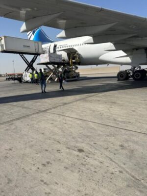 هذا وقد أقلعت الرحلة رقم (1711 MS)، فى تمام الساعة (2.30 ظهراً)، من مطار القاهرة الدولي محملة بشحنة مساعدات إنسانية ومستلزمات طبية بلغ وزنها( 22 طن) مقدمة من جانب الهلال الأحمر و وزارة الصحة.