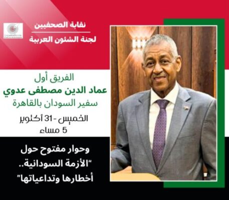 تستضيف لجنة الشؤون العربية والخارجية بنقابة الصحفيين، برئاسة الكاتب الصحفي حسين الزناتي، يوم الخميس المقبل الفريق أول عماد الدين مصطفى عدوي، سفير جمهورية السودان في مصر في حوار مفتوح تحت عنوان “مصر والسودان.. مصير واحد وأمن قومي مشترك”.