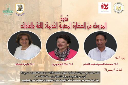 تعقد ندوة “الموروث من الحضارة المصرية القديمة : اللغة والعادات” بالتعاون مع كلية الآداب جامعة القاهرة ، وذلك في تمام الثانية عشرة ظهر اليوم الثلاثاء الموافق 3 ديسمبر الجارى بمدرج 78 المبنى الرئيسى بكلية الآداب جامعة القاهرة