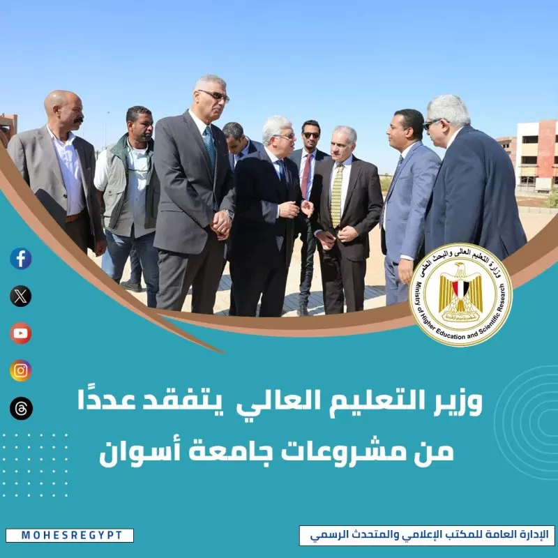 - تفقد الدكتور أيمن عاشور وزير التعليم العالي والبحث العلمي، عددًا من مشروعات جامعة أسوان، حيث تفقد الوزير مبنى كلية طب الفم والأسنان، والمبنى الجديد لكلية الطب، والمدينة الرياضية بصحاري، ومشروع إنشاء مستشفى الطوارئ والاستقبال بمستشفى أسوان الجامعي.