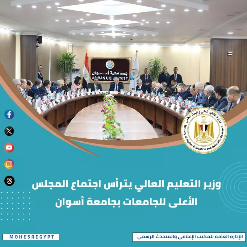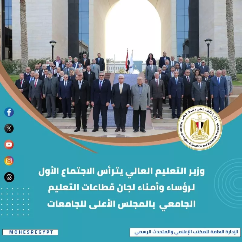 - ترأس الدكتور أيمن عاشور وزير التعليم العالي والبحث العلمي، الاجتماع الأول للدورة الجديدة للجان قطاعات التعليم الجامعي بالمجلس الأعلى للجامعات (الدورة 2025 – 2028)؛ لمناقشة خطة أداء لجان قطاع المجلس خلال الفترة القادمة، وأكد الوزير على الحرص الكبير على اختيار قامات علمية وفكرية لرئاسة وأمانة وعضوية لجان مختلف لجان القطاعات بالمجلس الأعلى للجامعات وذلك للاستفادة من خبراتهم العلمية المتراكمة في تنفيذ الاستراتيجية الوطنية للتعليم العالي والبحث العلمي.