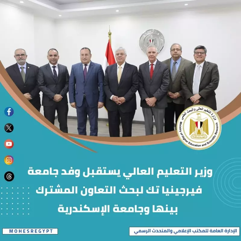 - استقبل الدكتور أيمن عاشور، وزير التعليم العالي والبحث العلمي، الدكتور سيريل كلارك، النائب التنفيذي للرئيس والمدير الأكاديمي لجامعة فيرجينيا تك، والوفد المرافق له، لمناقشة أوجه التعاون المشترك بين جامعة الإسكندرية وجامعة فيرجينيا تك الأمريكية، وخلال اللقاء بحث الجانبان تنفيذ زيارات متبادلة بين الطرفين لتعزيز التعاون المشترك بشكل أكبر، والتباحث حول إنشاء فرع دولي للجامعة ببرج العرب بالتعاون مع جامعة الإسكندرية.
