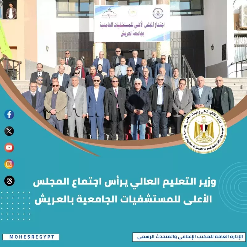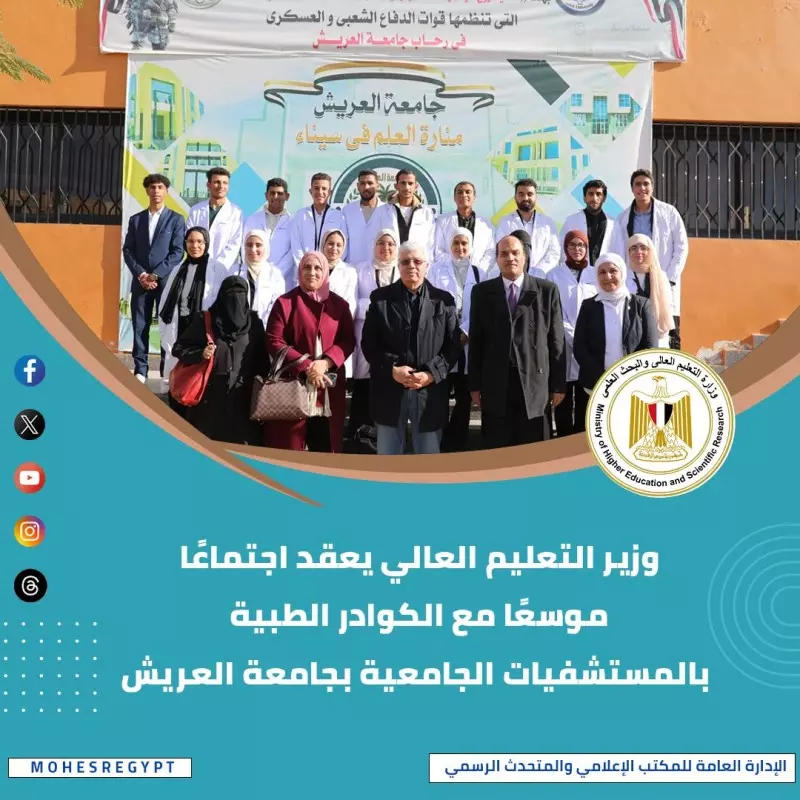 - عقد د.أيمن عاشور وزير التعليم العالي والبحث العلمي اجتماعًا موسعًا مع الكوادر الطبية بالمستشفيات الجامعية في مقر كلية الطب بجامعة العريش، وفي كلمته أكد الوزير اهتمام الوزارة بتطوير المنظومة الطبية وتوسيع نطاق خدماتها، مشددًا على حرص الوزارة على إنشاء كلية ومستشفى جامعي في كل محافظة من محافظات مصر، لا سيما في المحافظات الحدودية؛ بهدف تقديم خدمة طبية متميزة لجميع المواطنين في مختلف أنحاء البلاد، وأشار إلى الجهود المبذولة حاليًا لإنشاء مستشفى جامعي بكلية الطب بجامعة العريش.