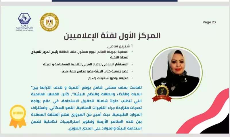 وتقدم بالتهنئة للزميلة شيرين سامى الكاتبة الصحفية بجريدة “العالم وعضو جمعية كتاب البيئة والتنمية والتى فازت بالمركز الأول بملف صحفى شامل يوضح أهمية و هدف الترابط بين “المياه والغذاء والطاقة والنظم البيئية”، كأبرز القضايا العالمية التي تتطلب حلولا شاملة لتحقيق الاستدامة، في عالم يواجه تحديات متزايدة جراء التغيرات المناخيةو النمو السكاني، واستنزاف الموارد الطبيعية، و ضرورة فهم العلاقة المعقدة بين هذه العناصر الأربعة وتطوير استراتيجيات تكاملية تضمن استدامة البيئة والموارد على المدى الطويل.