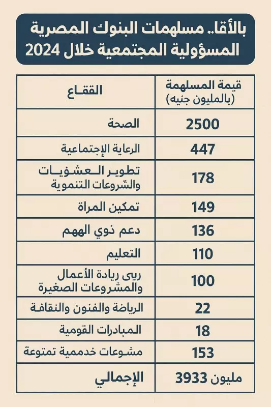 وجهت البنوك 22 مليون جنيه لدعم أنشطة الرياضة والفنون والثقافة، و18 مليون جنيه للمشاركة في المبادرات القومية، إلى جانب رعاية مؤتمر الصحة والسكان، بالإضافة إلى تخصيص نحو 153 مليون جنيه لمشروعات خدمية متنوعة في قطاعات متعددة.