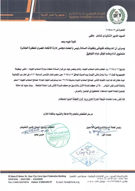 نتقدم نحن أولياء أمور لاعبات فريق نادي دلفي للكرة الطائرة – تحت 13 سنة – بهذه الشكوى لسيادتكم، وذلك بعد تعرض الفريق لقرار مجحف وظالم بإعادة مباراته أمام فريق نادي أصحاب الجياد، والتي أُقيمت ضمن منافسات بطولة الجمهورية للكرة الطائرة للبنات، يوم السبت الموافق 12 أبريل 2025، على ملاعب نادي الشمس بمدينة نصر.