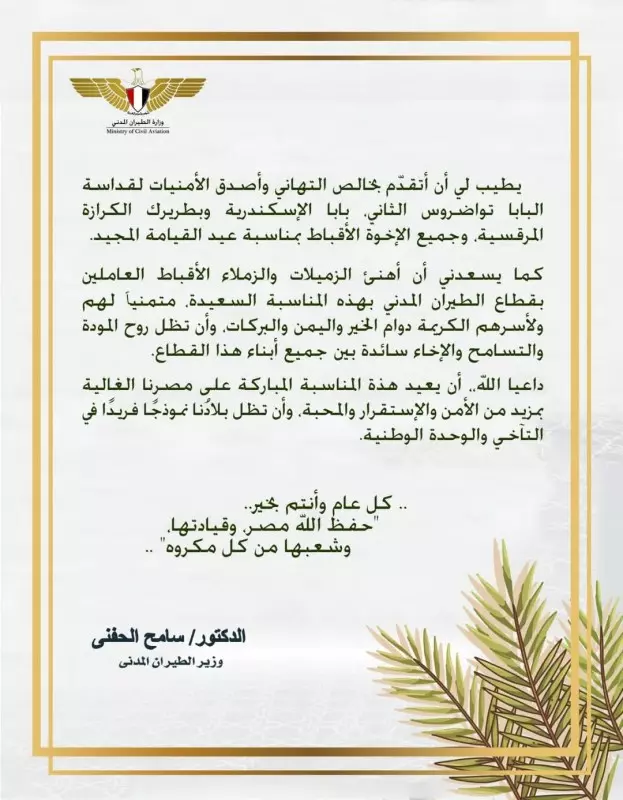 تقدم الدكتور سامح الحفني، وزير الطيران المدني، بخالص التهاني وأصدق الأمنيات لقداسة البابا تواضروس الثاني، بابا الإسكندرية وبطريرك الكرازة المرقسية، وجميع الإخوة الأقباط، بمناسبة عيد القيامة المجيد.