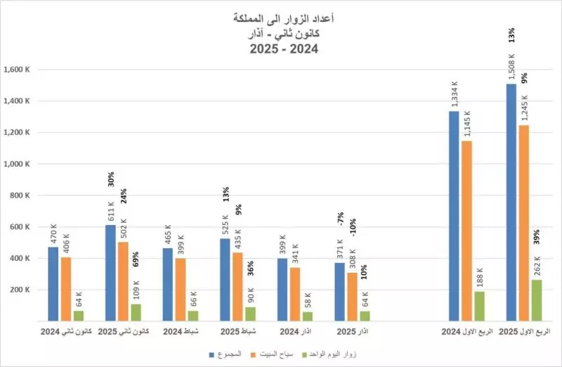 وبلغ إجمالي عدد الزوار الدوليين خلال الربع الأول (كانون الثاني – آذار) من عام 2025، نحو 1,507,546 زائرًا بنسبة ارتفاع 13.0% مقارنة بعام 2024 لنفس الفترة، حيث بلغ عدد الزوار 1,333,775 زائرًا.